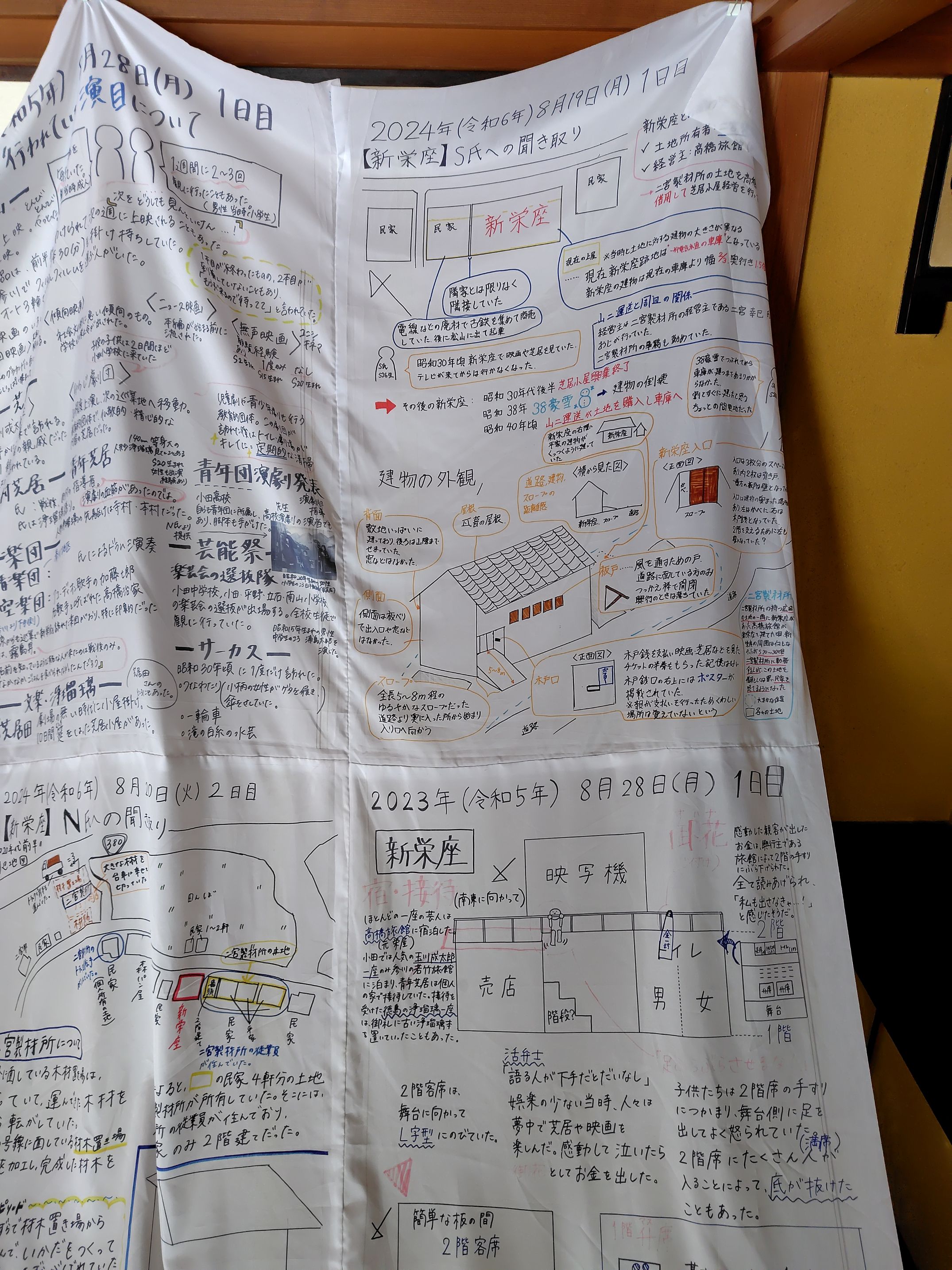 13 年間にわたって聞き取った内容をテーマごとに 1 枚の模造紙に書き込み、さらにそれを転写した布です。